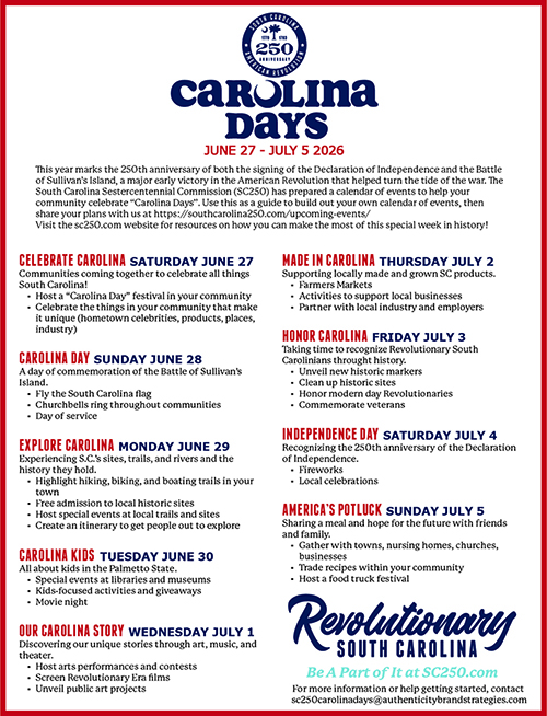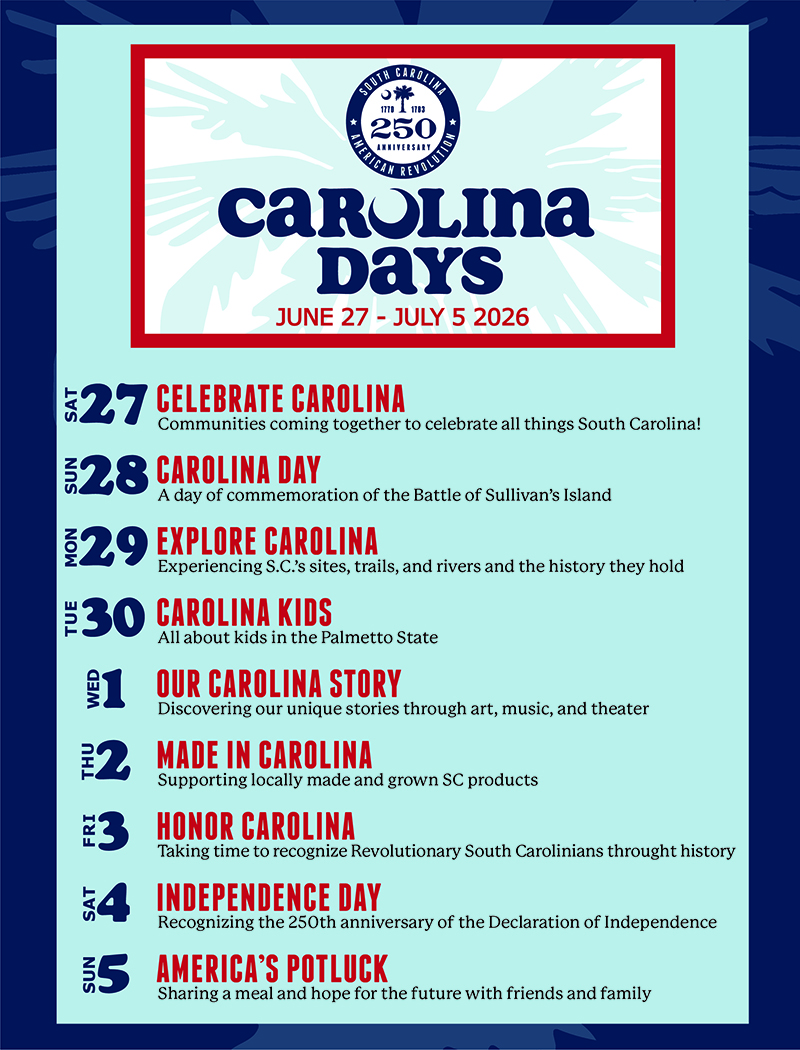 To help counties plan meaningful and manageable local commemorations, SC250 has developed a “Carolina Days Menu,” a flexible framework running from June 27 through July 5, 2026. Each day highlights a theme that connects our past to our present. We encourage each county to interpret these themes in your own way and to adjust them to fit your unique community.