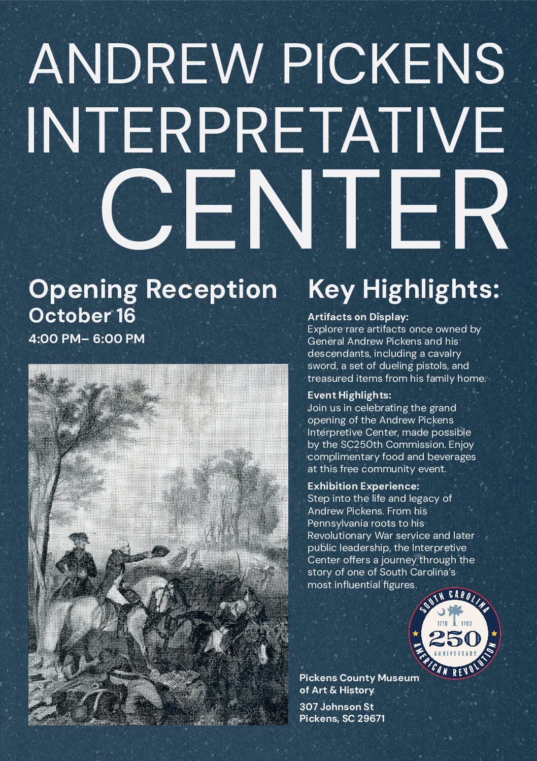 Join us in celebrating the grand opening of the Andrew Pickens Interpretive Center, made possible by the SC250th Commission. Enjoy complimentary food and beverages at this free community event. The exhibit features rare artifacts once owned by General Andrew Pickens and his descendants, including a cavalry sword, a set of dueling pistols, and treasured items from his family home. Step into the life and legacy of Andrew Pickens. From his Pennsylvania roots to his Revolutionary War service and later public leadership, the Interpretive Center offers a journey through the story of one of South Carolina’s most influential figures.