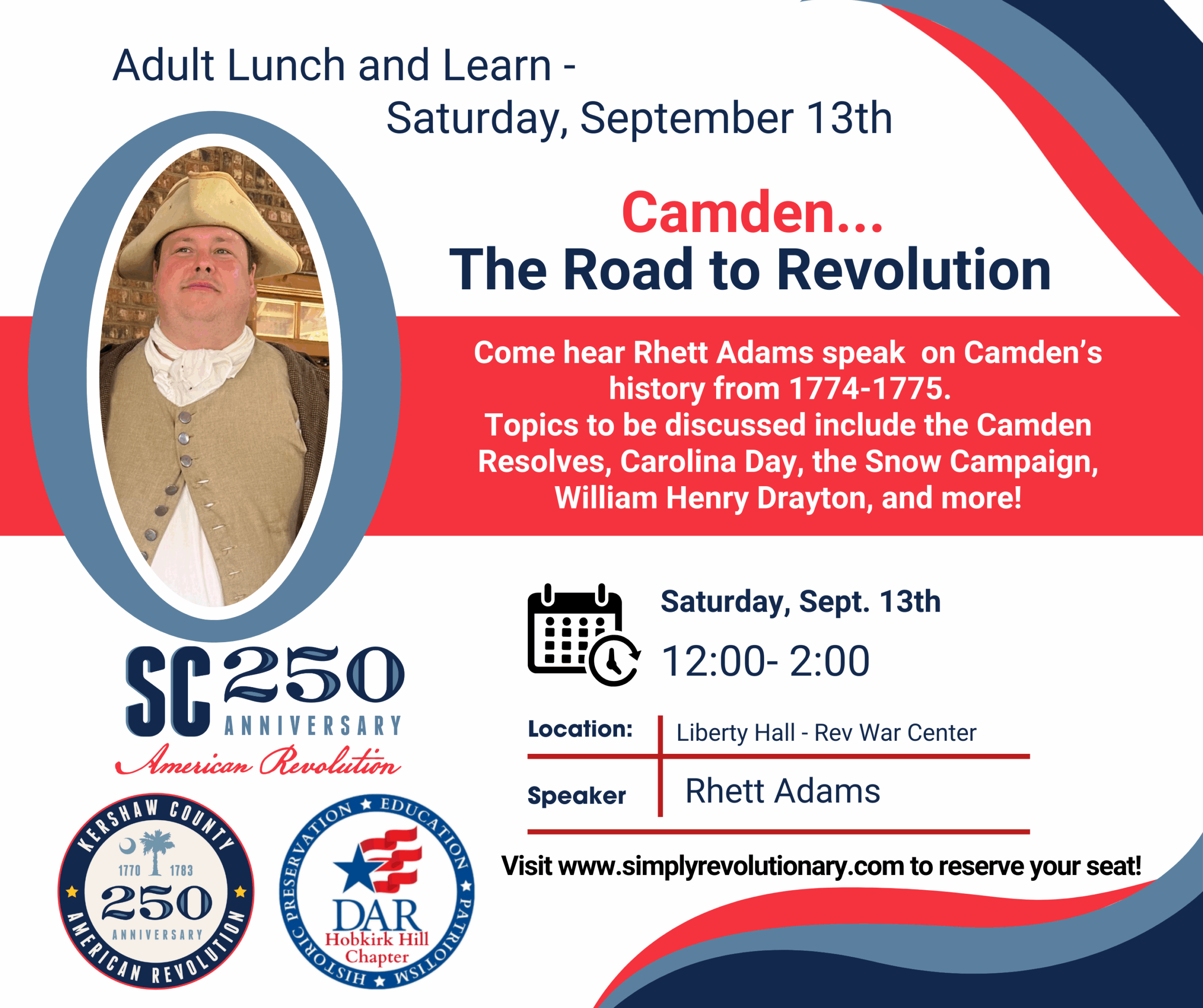 Lunch and Learn program: Come hear Rhett Adams, Kershaw County 250 committee member, speak on Camden’s history from 1774-1775. Topics will include the Camden District Resolves, Carolina Day, the Snow Campaign, William Henry Drayton, and more! You bring your lunch and we’ll provide the learning!