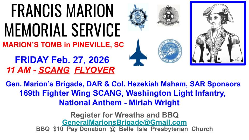 Fans of the Swamp Fox, General Francis Marion, will gather together to honor his memory with a wreath ceremony. Organizations and individuals are invited to attend and present a wreath. This is an annual service conducted on February 27, the day of Marion's death in 1795. Please see the flyer for more information.