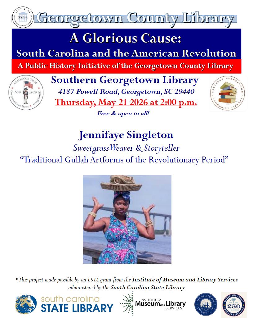 *Part of “A Glorious Cause: South Carolina and the American Revolution: A Public History Initiative by the Georgetown County Library,” sweetgrass weaver and storyteller Jennifaye Singleton, who has been practicing the ancient art of Gullah Geechee basket-weaving since 1990, views sweetgrass weaving not only as a distinct cultural artifact but also as a divine gift passed down through generations. Participants will learn about the long, rich history of sweetgrass weaving as a means of deep cultural bonding and communal expression for the Gullah Geechee people.