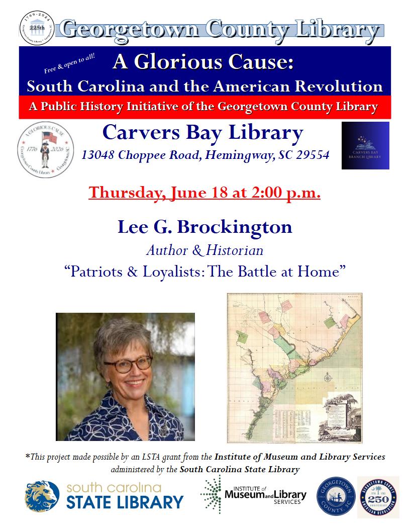 *Part of “A Glorious Cause: South Carolina and the American Revolution: A Public History Initiative by the Georgetown County Library,” the ever-popular Lee G. Brockington will bring our series to a grand finale with her fascinating presentation on conflicts between Patriots and Loyalists right here at home in Georgetown County. An author and cultural historian, Brockington is a signature figure when it comes to her knowledge of the intricacies of Georgetown County’s multifaceted history. Her books include Plantation Between the Waters: A Brief History of Hobcaw Barony; Pawleys Island with Steve Roberts; and the new edition of Pawleys Island: Stories from the Porch. For decades, she served as Senior Interpreter of History for The Belle W. Baruch Foundation at Hobcaw Barony, and Brockington continues to deliver public educational presentations on a range of topics of local and area interest, while also leading history-based tours of important area sites by land and by water.