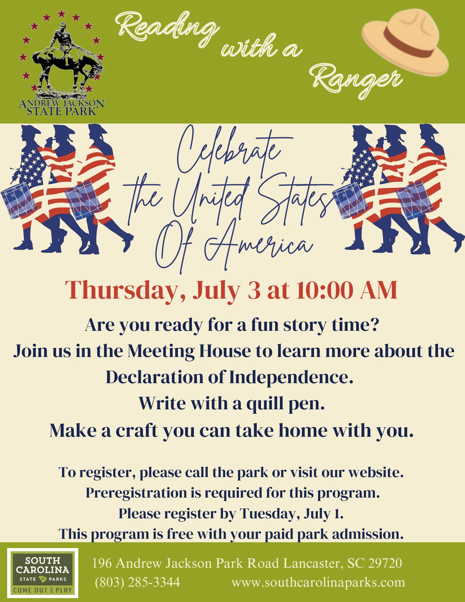 Are you ready for a fun story time? Come out and read with a Park Ranger! We will be reading a special children’s book about the 4th of July. Learn about the Declaration of Independence. Write with a quill pen. Make a craft you can take home with you. The program will take place on Thursday, July 3, 2025 at 10:00 AM. Preregistration is required for this program. Please register by Tuesday, July 1. This program is free with your paid park admission.