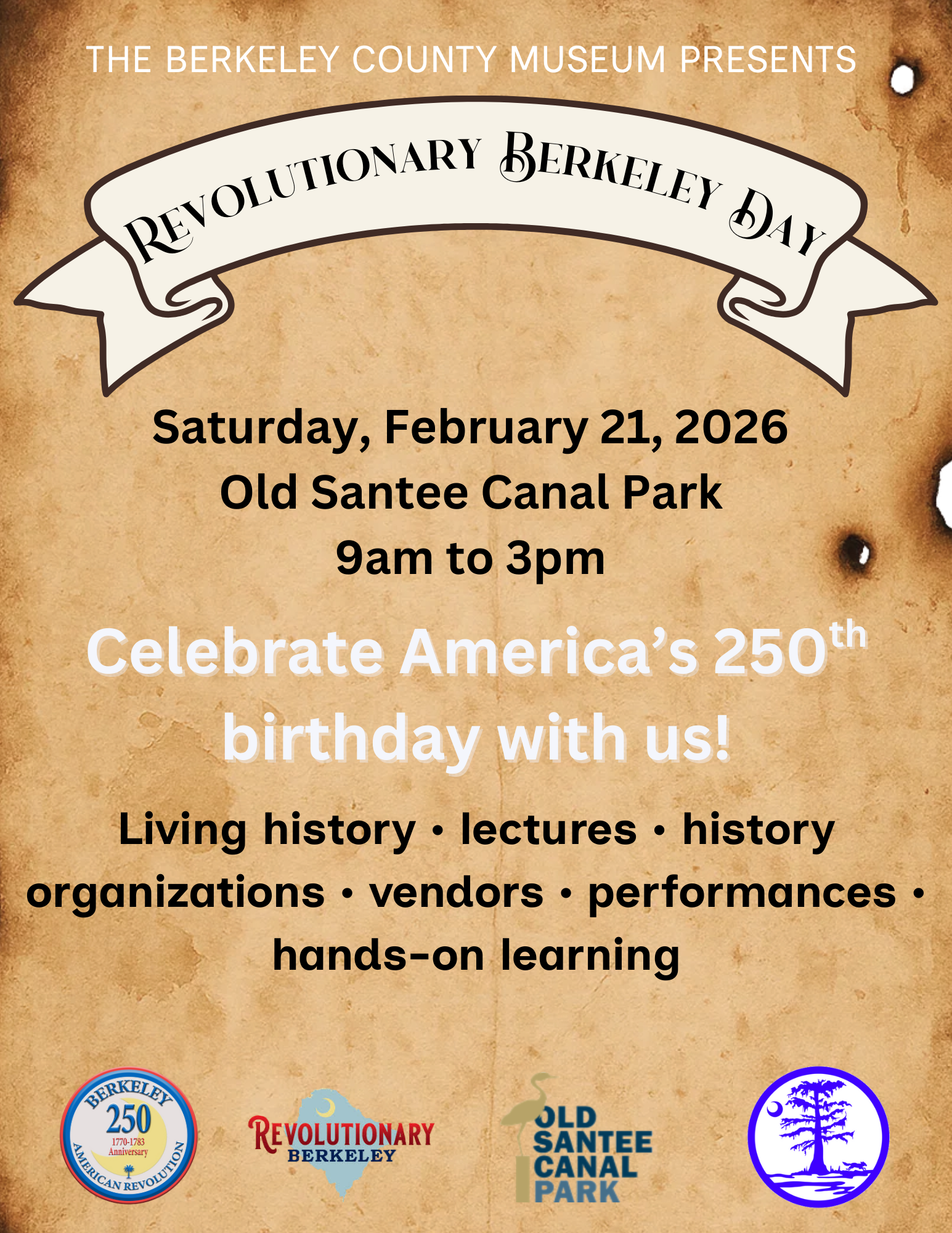 Celebrate America’s 250th Birthday with us at Revolutionary Berkeley Day! Colonial Day is the Museum’s biggest fundraiser and flagship colonial and Revolutionary War event, bringing in 3,500 visitors the first four years. This year, we’re rebranding the event as Revolutionary Berkeley Day. But don’t worry! The grounds of the Museum and Old Santee Canal Park will continue to come alive with 18th-century living historians, lectures, artillery demos, and golf cart rides to Fort Fair Lawn. This year’s event is February 21, 2026.
