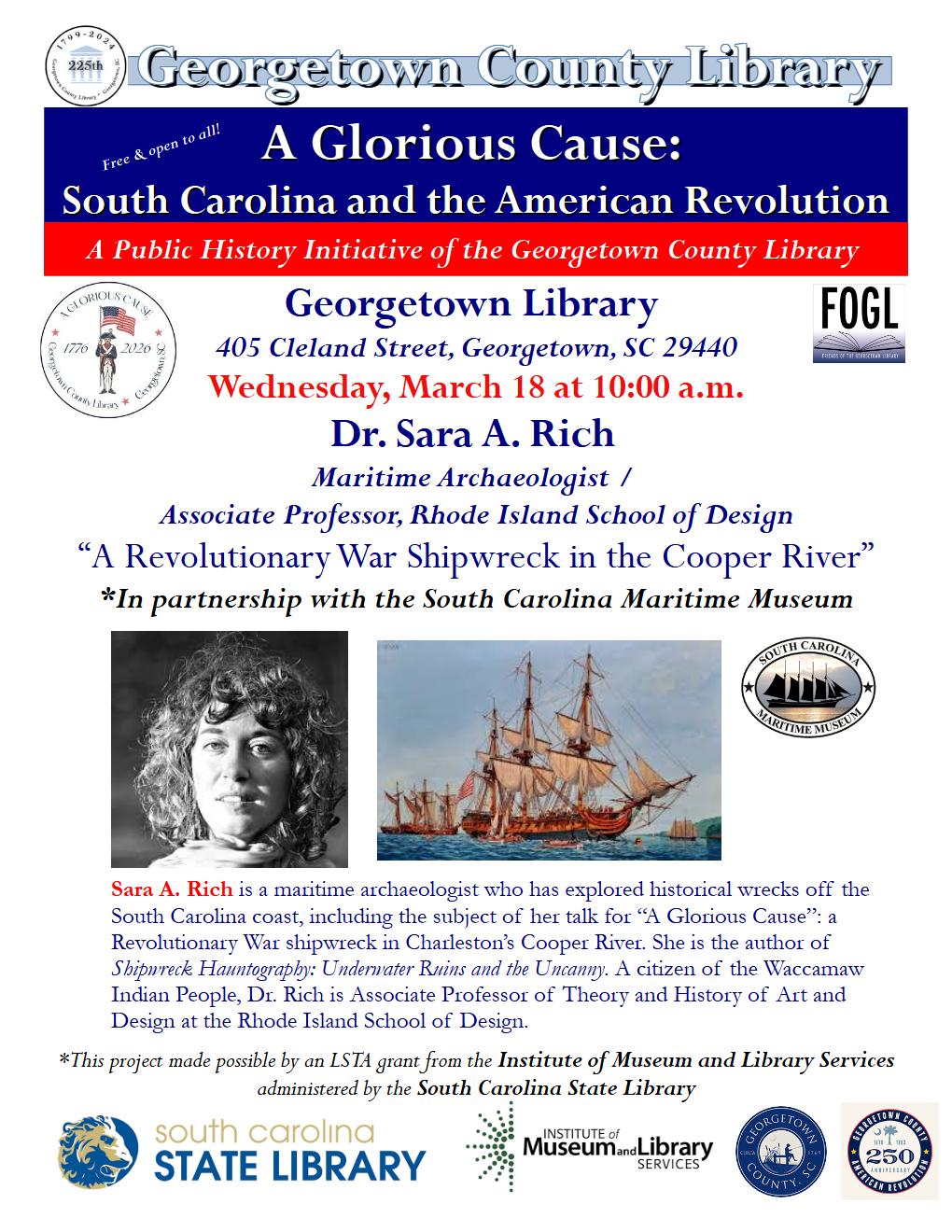 *Part of “A Glorious Cause: South Carolina and the American Revolution: A Public History Initiative by the Georgetown County Library,” Dr. Sara A. Rich, a prolific author and maritime archaeologist at the Rhode Island School of Design (RISD), will delve into the remains of a Revolutionary War shipwreck buried for centuries beneath the murky waters of the SC Lowcountry’s Cooper River. What secret histories can the shipwreck whisper to us from the deep? Dr. Rich’s presentation will be delivered in partnership with the South Carolina Maritime Museum.
