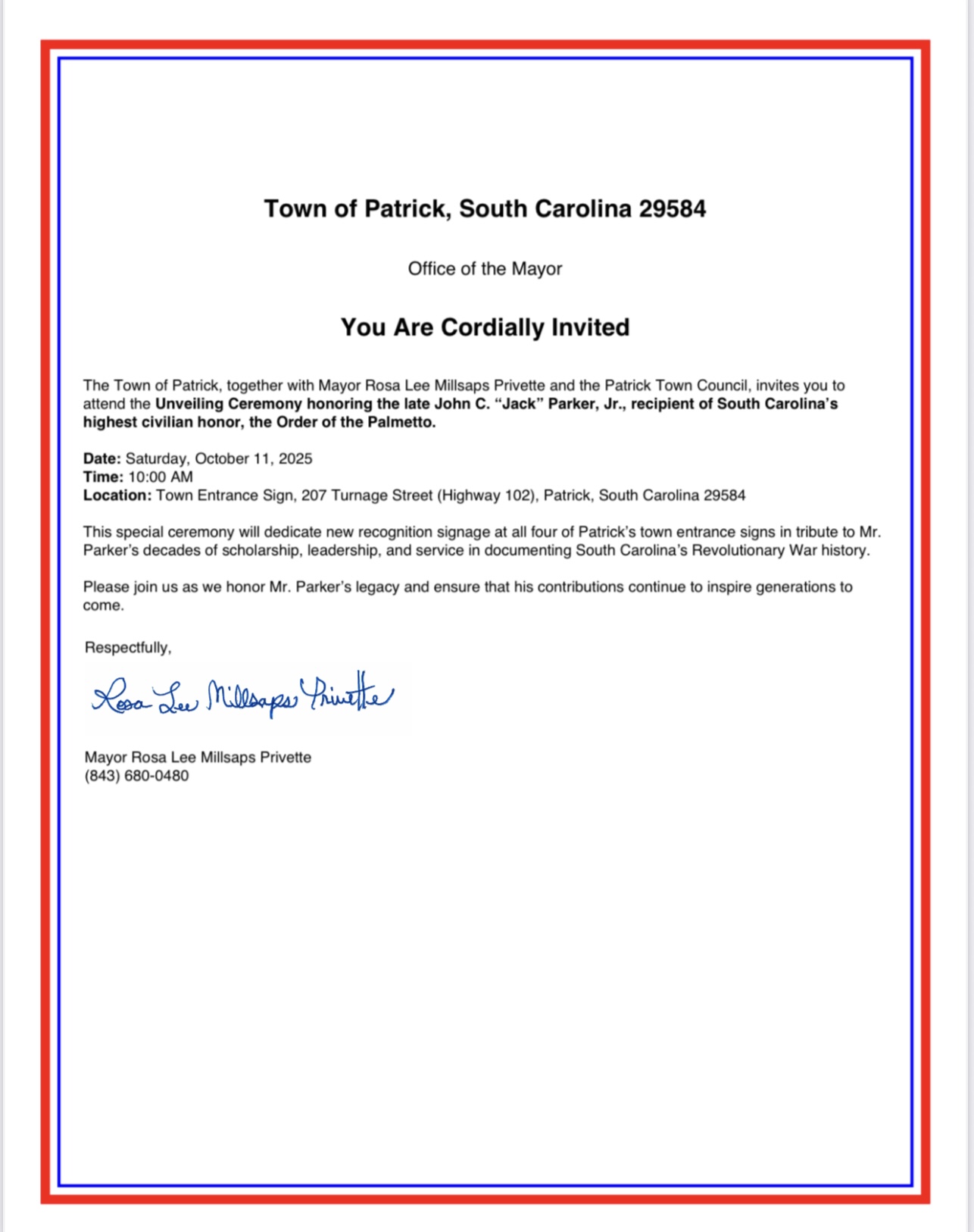 The Town of Patrick, together with Mayor Rosa Lee Millsaps Privette and the Patrick Town Council, invites you to attend the Unveiling Ceremony honoring the lat John C. Jack Parker,