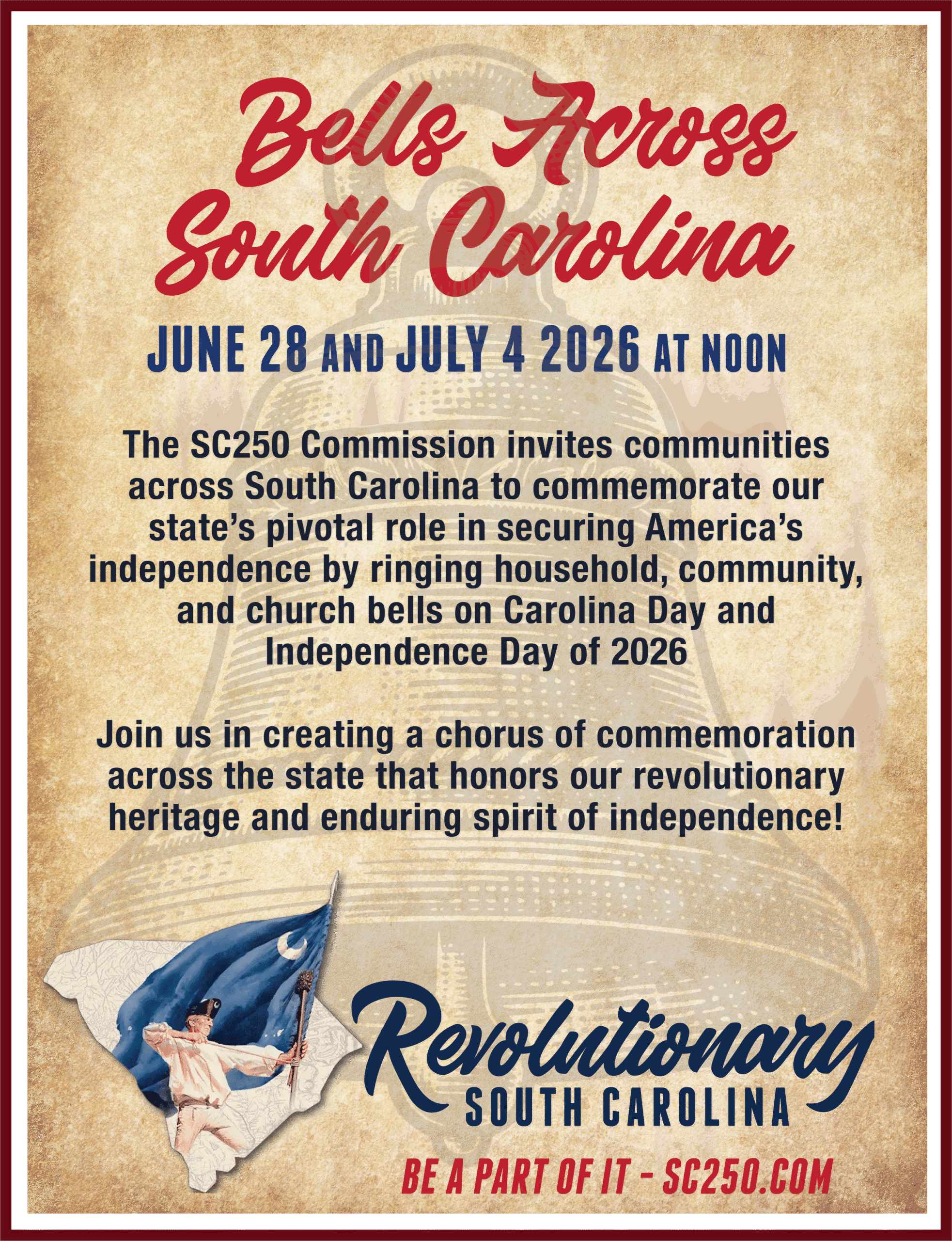 The SC250 Commission invites communities across South Carolina to commemorate our state’s pivotal role in securing America’s independence by ringing household, community, and church bells on Carolina Day and Independence Day of 2026. Join us in creating a chorus of commemoration across the state that honors our revolutionary heritage and enduring spirit of independence!